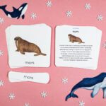 Karty trójdzielne Montessori oraz karty opisowe z wizerunkami zwierząt Arktyki.